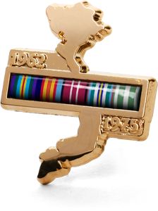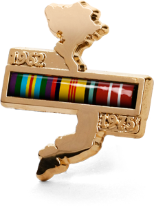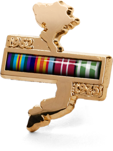 The gold plated lapel pin in the shape of Vietnam features the ribbons of the Vietnam campaign medals and the Anniversary of National Service