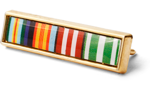 medal ribbons on a printed insert. The pin comes on a presentation